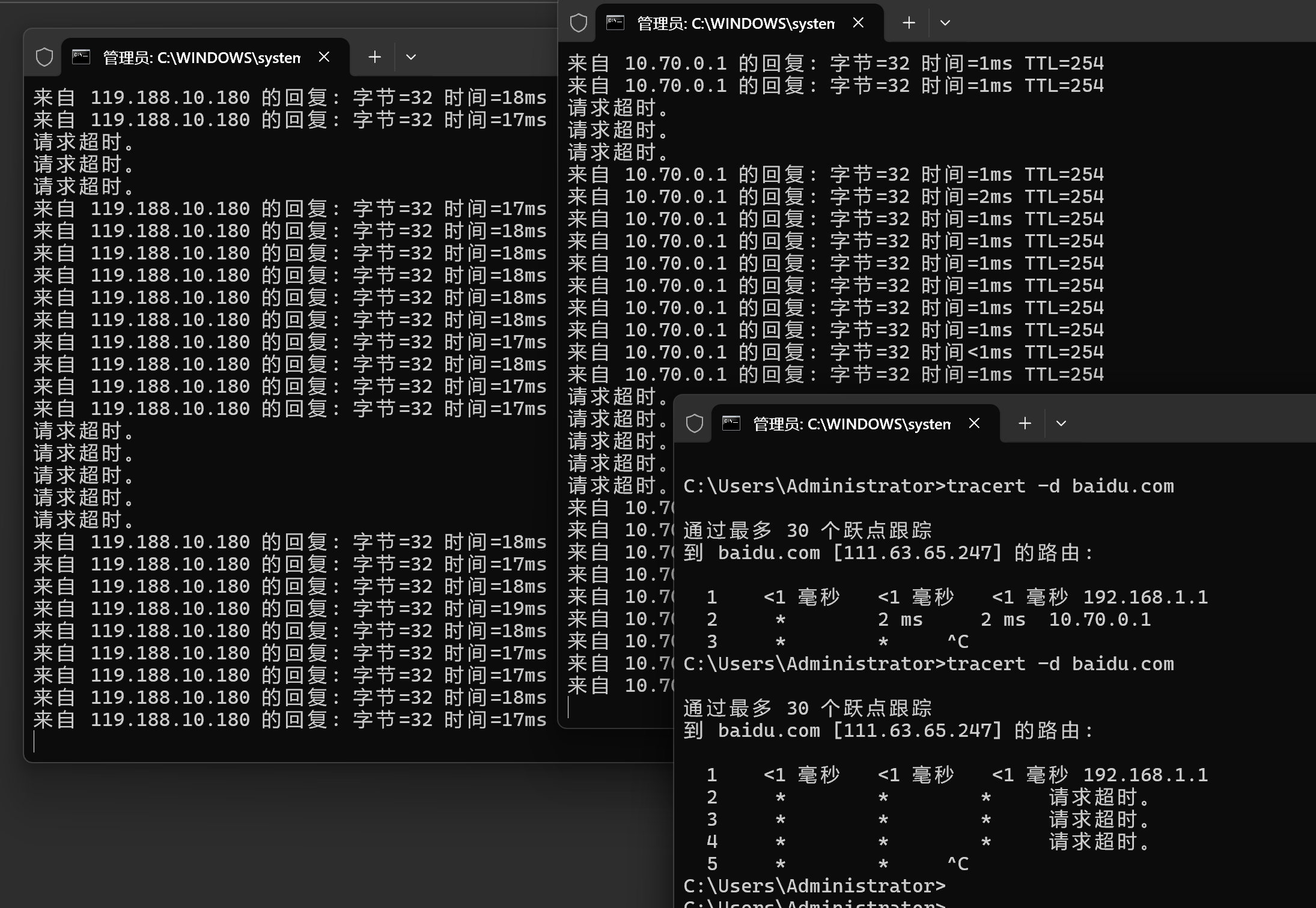 tracert baidu.com,第一跳(192.168.1.1)无丢包,但从第二跳(10.70.0.1)开始出现与外网一致的丢包; - 在浏览器中访问