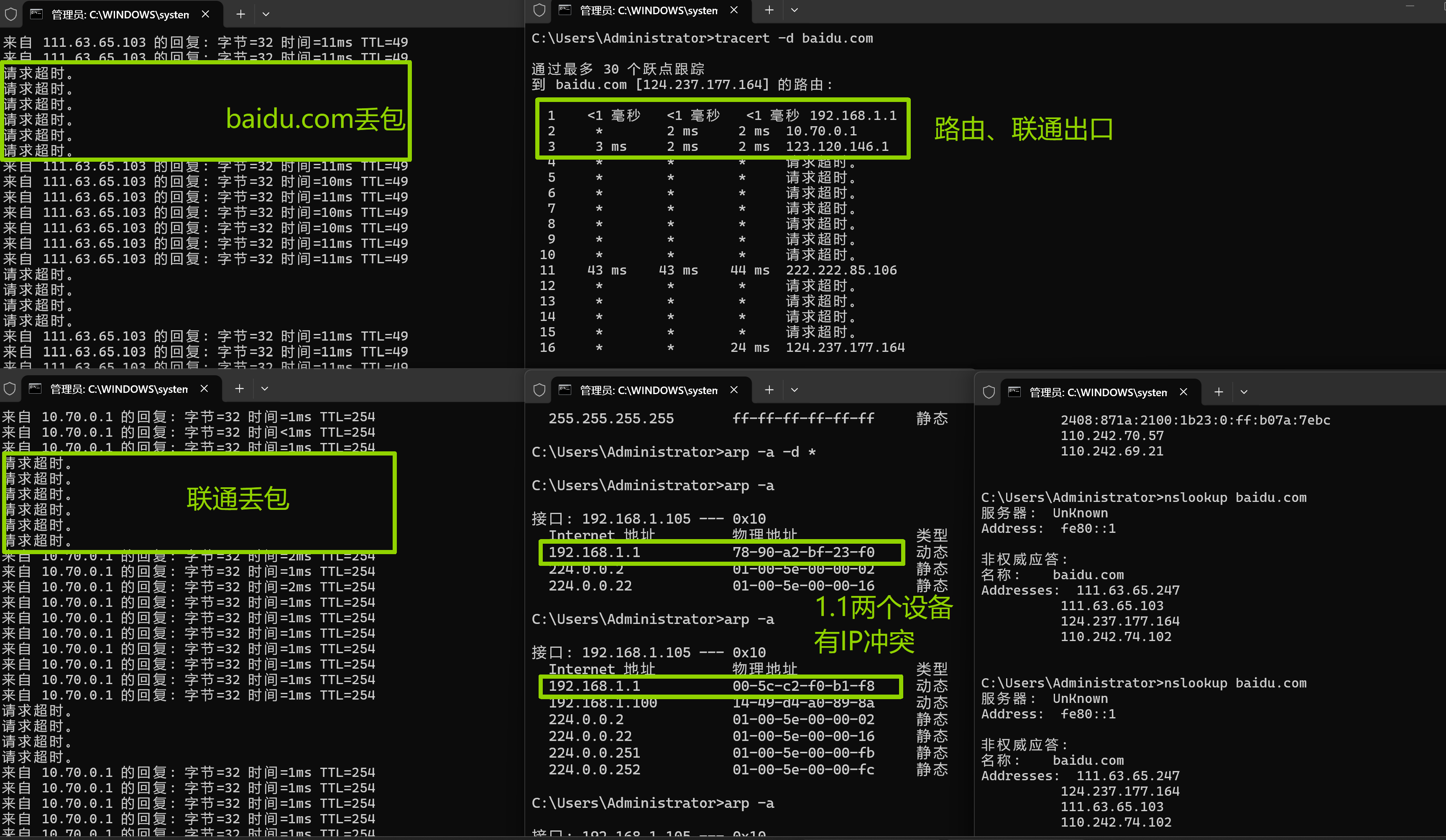 这些现象表明:本地网络存在不稳定性,且192.168.1.1身份不唯一。