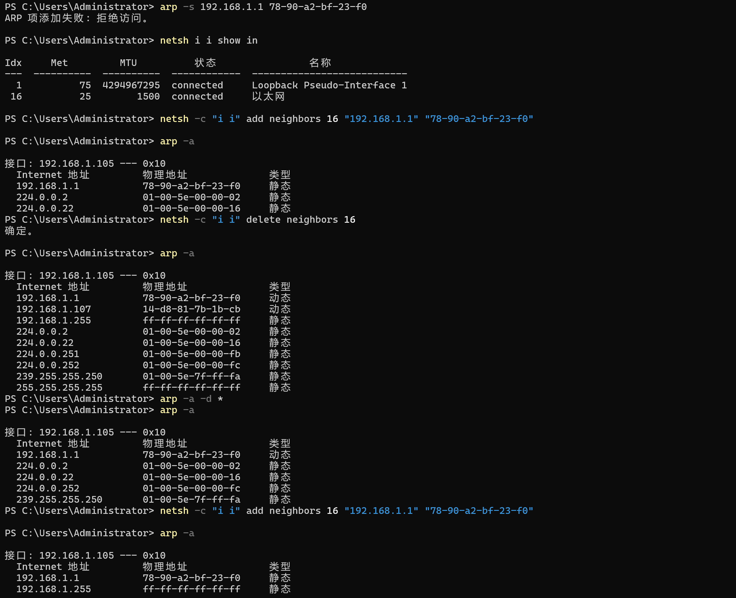 netsh interface ipv4 add neighbors 16 "192.168.1.1" "78-90-a2-bf-23-f0"